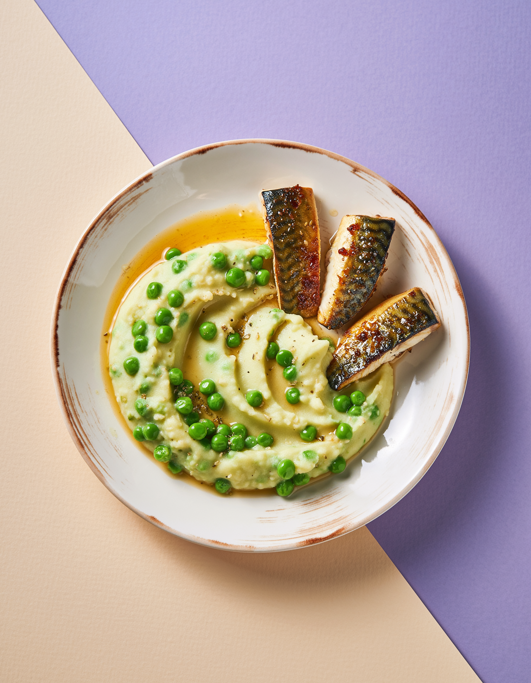 Schil en kook de aardappelen 20 minuten. Stamp met boter en breng op smaak met zout en peper. Kook de doperwten in 5 minuten gaar en giet af. Verhit de olie in de koekenpan en bak de makreel 3 minuten per kant. Meng de doperwten door de aardappelpuree en serveer de makreel ernaast.