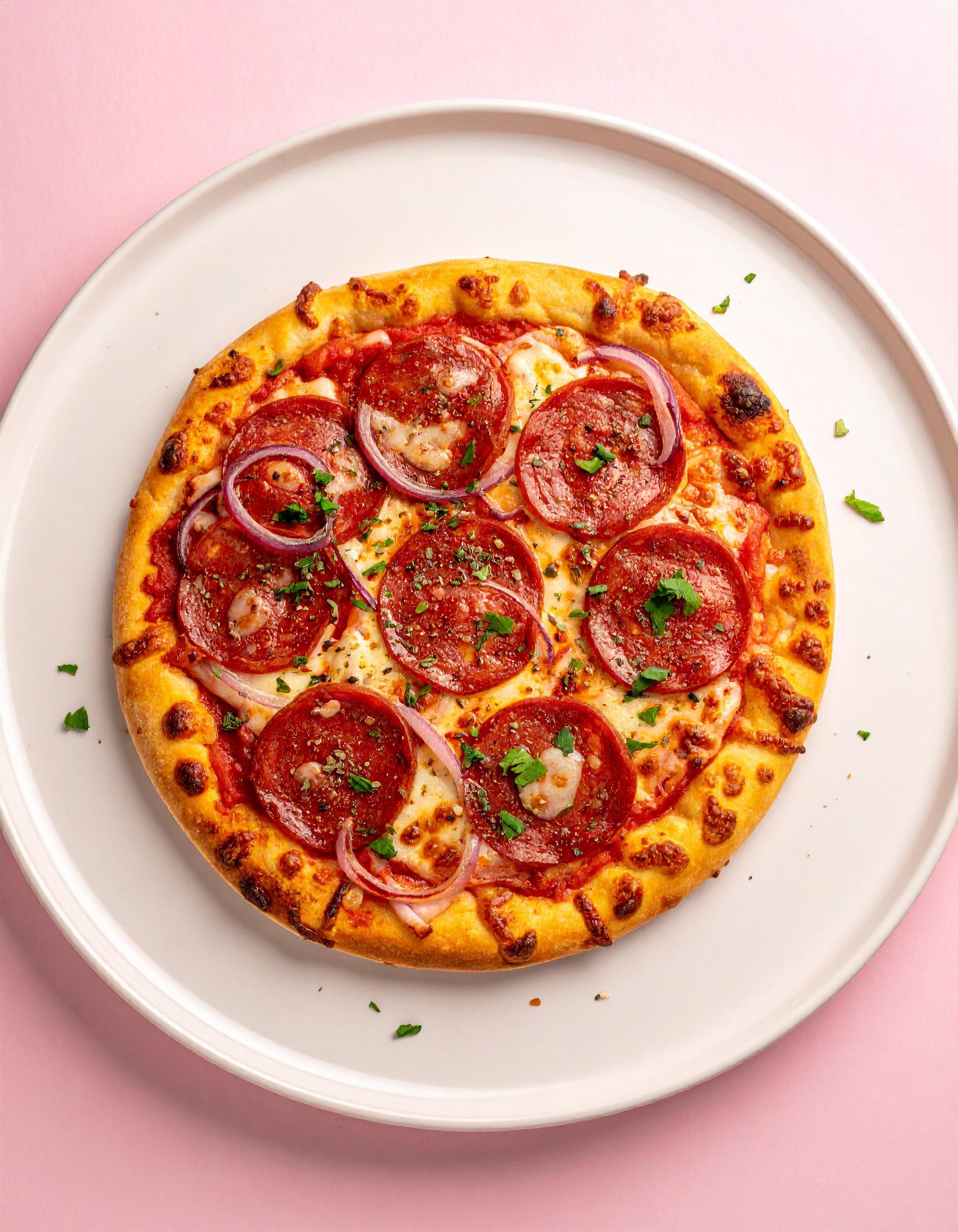 Verwarm de oven voor op 200 graden. Snij het brood doormidden en doe op elke helft een beetje olijfolie. Snij de ui in ringen. Smeer beide kanten van het brood in met tomatenpuree. Bedek met salami, ui en kaas en doe er kruiden naar smaak op. Heb je geen oven, bak het in de koekenpan op laag vuur en doe de deksel even op de pan om de kaas goed te laten smelten. Zodra de kaas gesmolten is, is de pizza klaar.