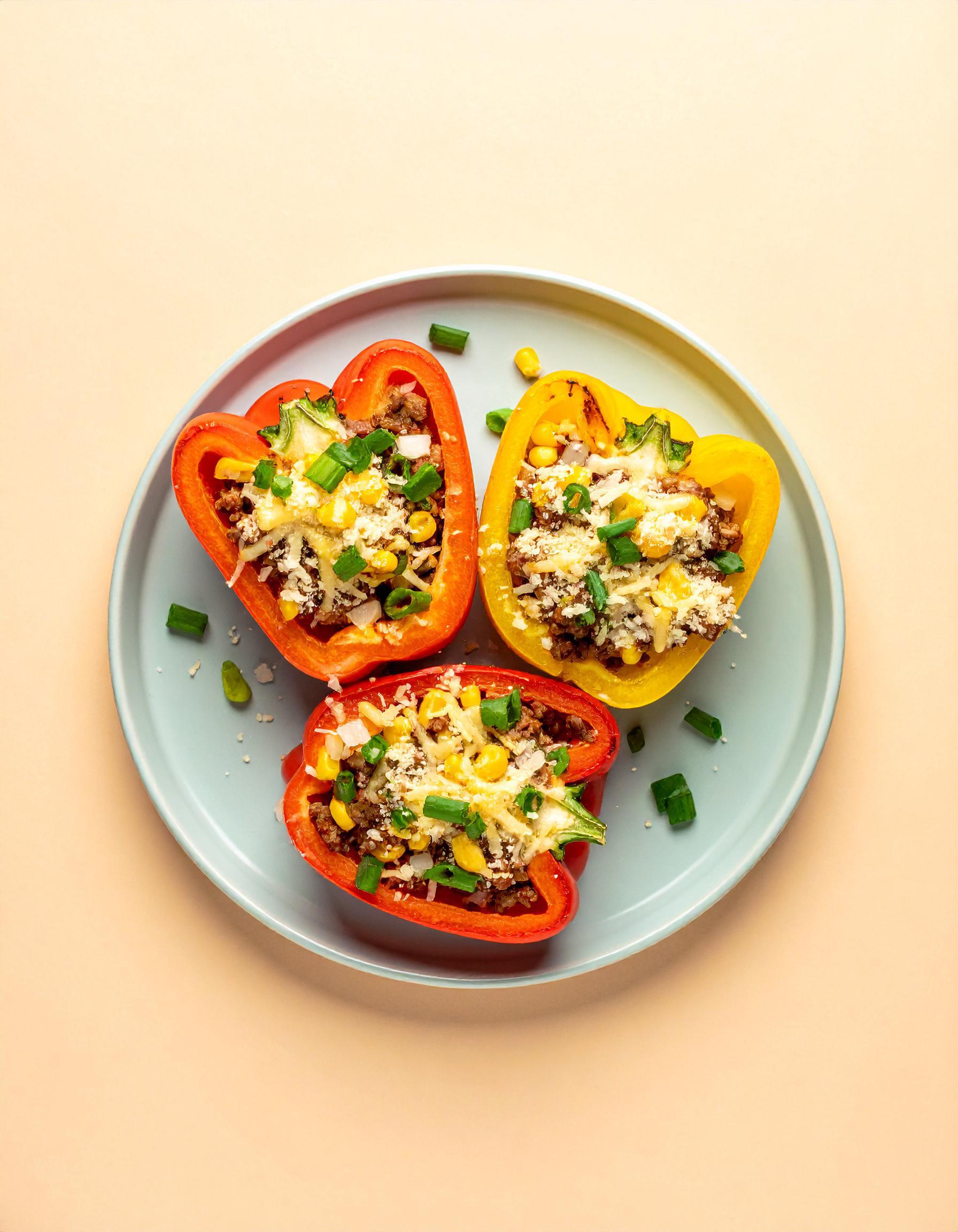Snij de paprika doormidden en verwijder de zaadleiders en zaadjes. Vul ze met het gehakt mengsel en bestrooi met kaas. Bak de gevulde paprika 15 minuten in de oven. Garneer met de bosui en serveer met een schepje zure room.